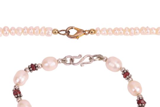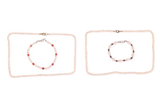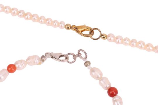 A small group of pearl jewellery items, comprising a coral and cultured pearl bracelet, a pearl and bead bracelet and two cultured pearl necklaces; 57.7 grams (4).
