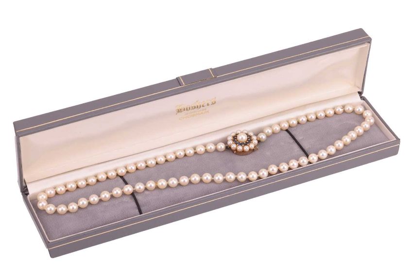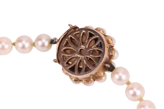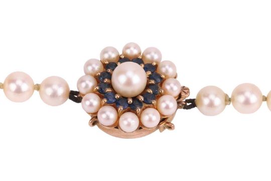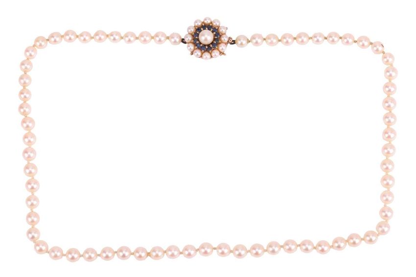 A cultured pearl necklace with gem-set clasp in 9ct gold, comprising a strand of round cultured pearls of 6.0 mm, hand-knotted to a cluster box clasp set with circular-cut sapphires and cultured pearls, British assay marks, overall length 50.0 cm, 30.4 grams.