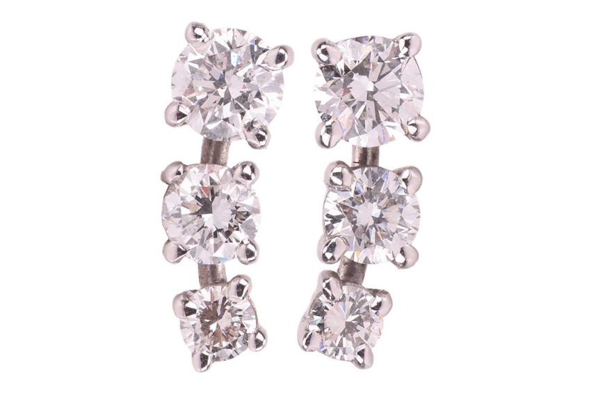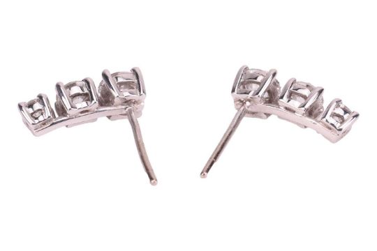 A pair of diamond-set stud earrings, each consisting of three graduated round brilliant-cut diamonds, with an estimated total weight of 1.00ct for the pair, ear post fittings, butterfly backs deficient, unmarked white metal surface testing as 18ct, 1.3 cm, 1.7 grams.
