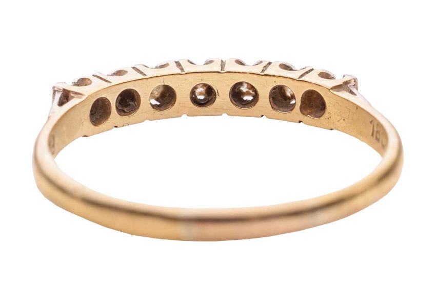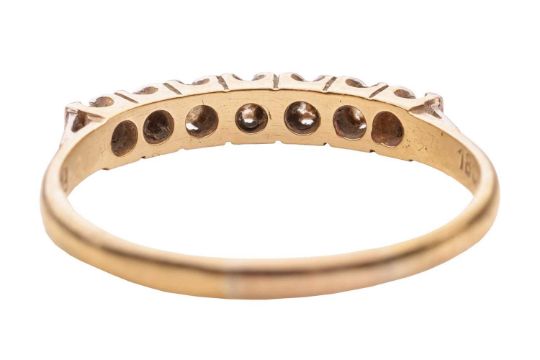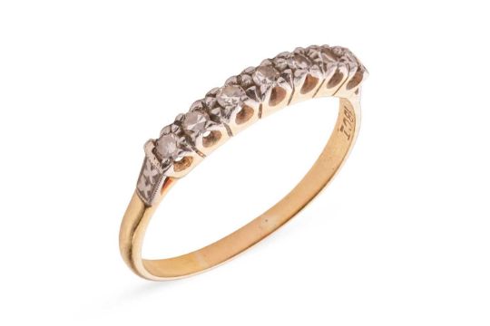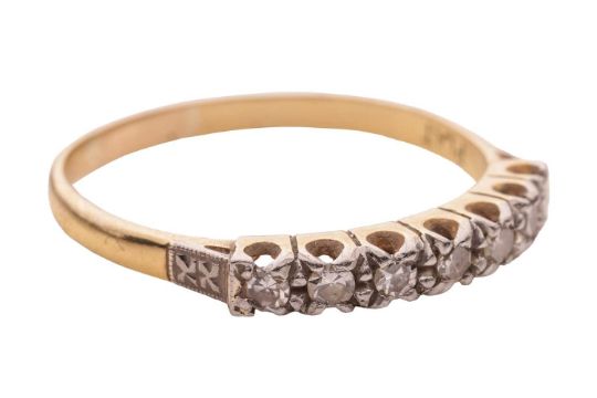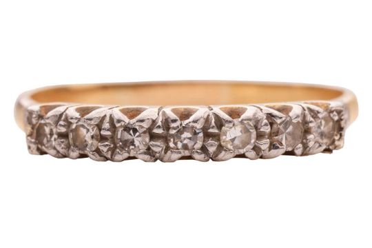 A diamond-set half hoop ring, claw-set with seven single-cut diamonds, to a bi-colour metal mount marked ‘18ct’ and ‘Plat’, size Q; 2.3 grams