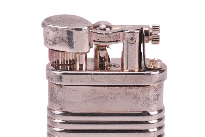 Dunhill Unique 'Tin Can' lighter, silver-plated on brass, signed and numbered, no box, 6.5 cm tall.
