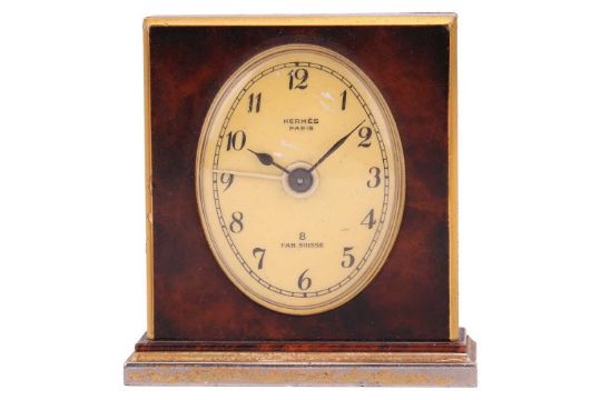 A Hermes of Paris, 8-day travel alarm clock, of architectural form with gilt brass body and faux tortoise shell effect panels, the oval Arabic dial with luminous alarm indicator.