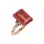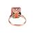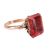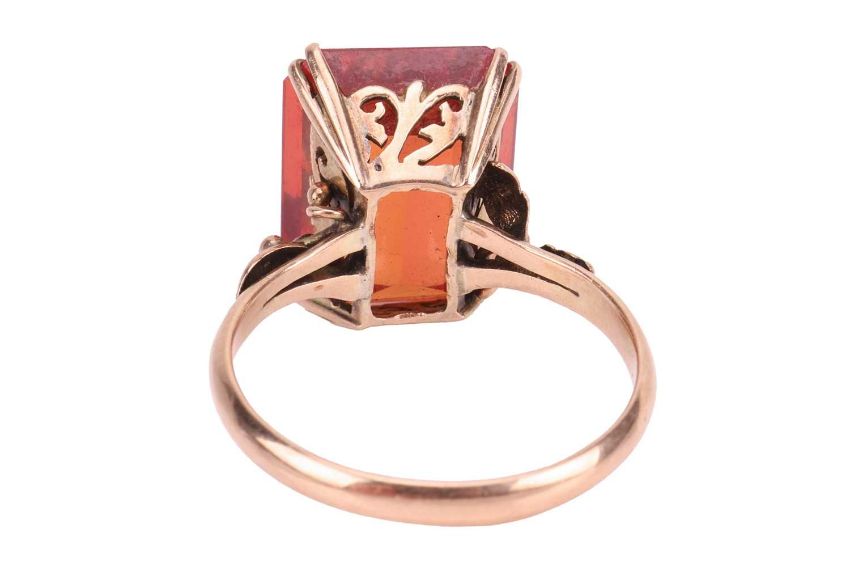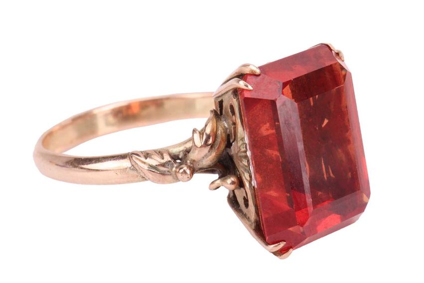 A synthetic orange sapphire ring, with an emerald-cut synthetic sapphire in reddish-orange colour, double claw set on a yellow metal mount, floral details on gallery and shoulders, to a D-profile shank, marked '14k', ring size O, total weight of item 4.8 grams.