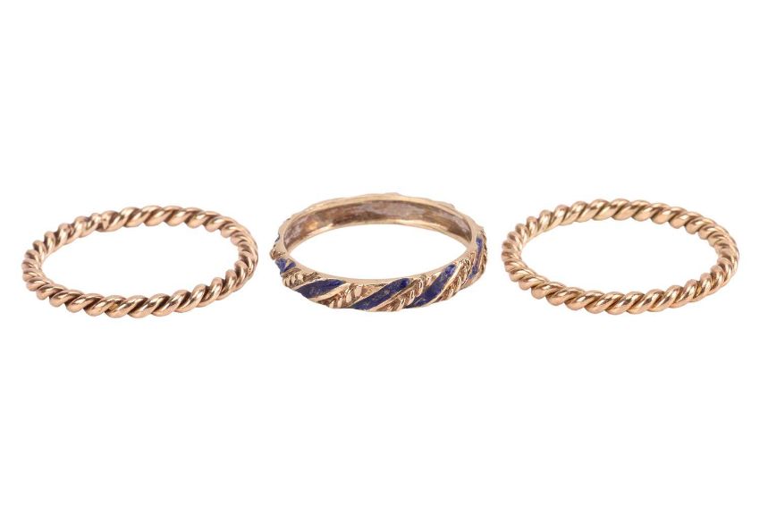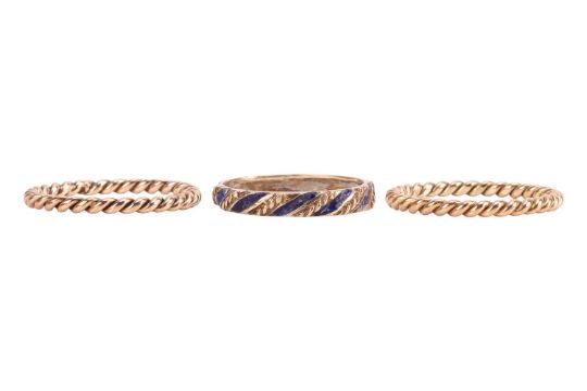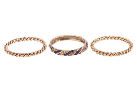 Three stacking rings; to include a 9ct gold twisted rope ring, with British assay mark, size S; a matching ring of conforming design in size R½, yellow metal surface testing as 9ct; and an enamel band with twisted cable design, in unmarked yellow metal testing as 14ct, size R; total weight of items 5.8 grams. (3)