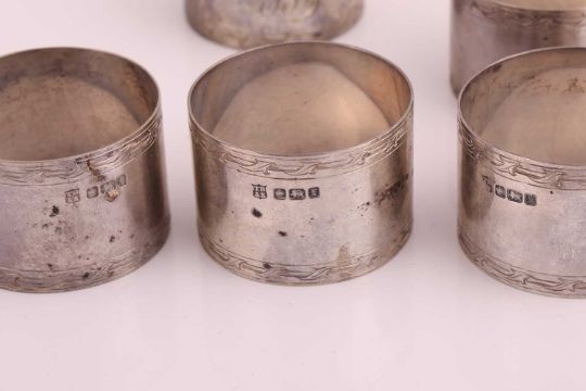 A group of silver items, including silver vesta cases, napkin rings and a silver mesh evening purse, 1950s Bulova 30 jewel automatic gentleman's wristwatch, together with five silver napkin rings, collar bars, dress set and other items, 8.52 ozt/ 265 grams combined weight of weighable silver