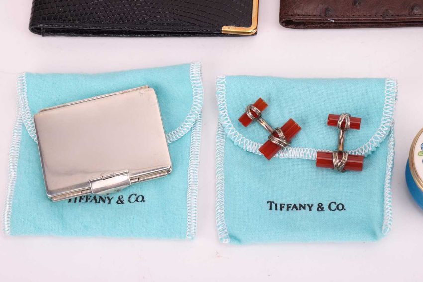 A group lot of silver and decorative items; to include, a pair of Tiffany & Co. silver and carnelian cufflinks in pouch, a Tiffany folding silver picture frame with pouch and box, a pair of Asprey salt and pepper mills, an Asprey card holder, and a Must de Cartier card holder with box and pouch, two Limoges ceramic trinket boxes together with other decorative items.