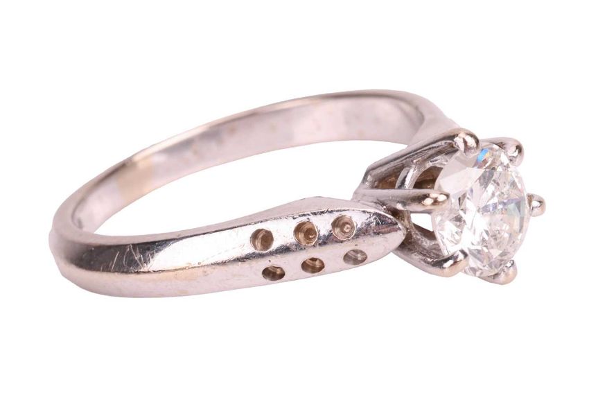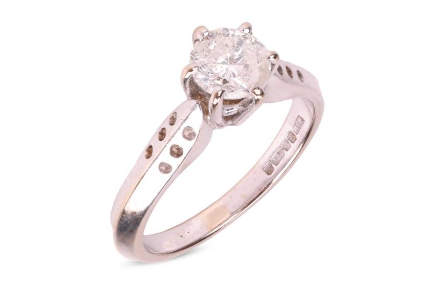 A diamond solitaire ring, comprising a central round brilliant-cut diamond in a six claw setting, with an estimated carat weight of 0.83ct, to tapering shoulders with circular drilled detail, to an 18ct white gold knife-edge band, size N, 4.9 grams.