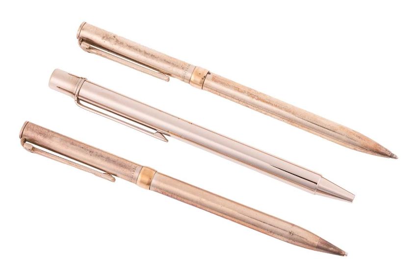 A pair of Tiffany & Co. T-clip ballpen and mechanical pencil, marked '925' and individually cased in associated pouch and box; together with a cased Must de Cartier Stylo ballpen. (3)