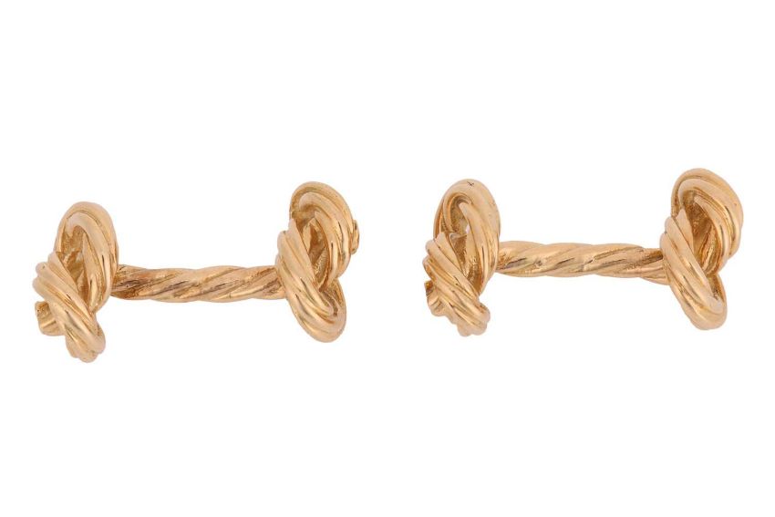 A pair of 'Marine knot' cufflinks, textured and terminated with nautical rope knot motifs, yellow metal marked '18ct', overall measures 2.5 cm wide, the total weight of items 13.83 grams.