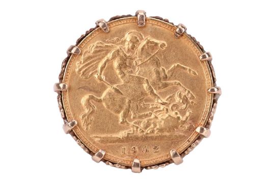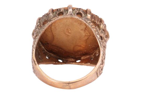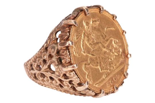 An Edward VII 1902 half sovereign in 9ct gold ring mount, of scrolled foliate design with twisted cable details, size L, 8.5 grams.