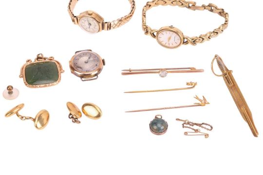 A pair of oval cufflinks; the hollow plaques with traces of an 18 carat mark (one chain link broken) 6.5 grams; a single stone aquamarine bar brooch, two Victorian stick pins, a Victorian swivel seal, a small gilt metal desk seal, two 9 carat gold wristwatches and a small quantity of other gilt metal jewellery in a leather jewellery case.