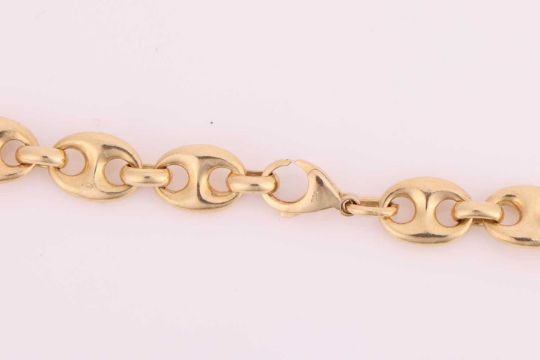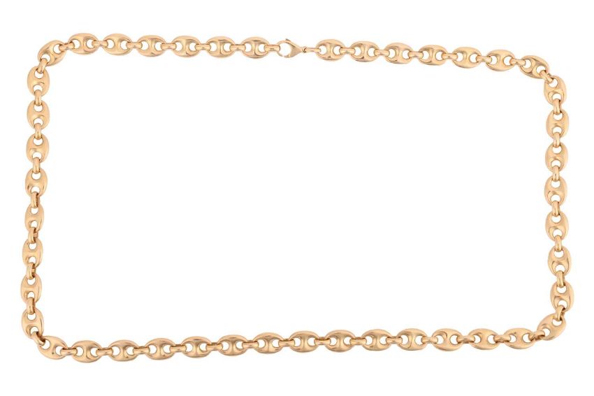 A long heavy anchor link chain, fastened with lobster clasp, marked as '750', link width 8.6 mm, overall measuring 61.5 cm in length, total weight of item 97.3 grams.