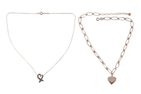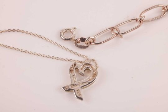 A Tiffany & Co. loving heart necklace by Paloma Picasso, marked ‘925’ with maker’s marks, together with a white metal oval link necklace with heart pendant, marked ‘925’; 15.0 grams (2)