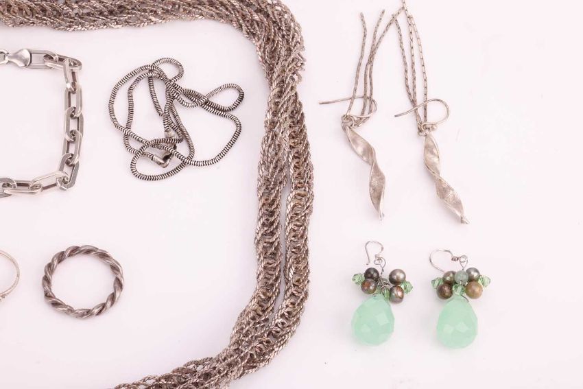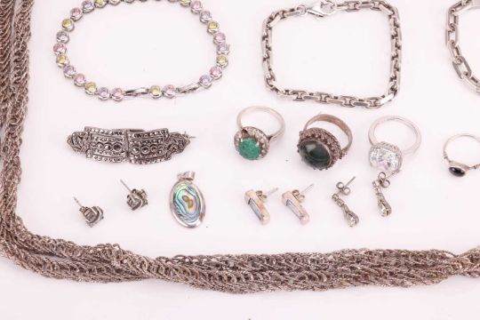 A mixed group of items, the majority jewellery, including an oval link bracelet, marked ‘925’, several pairs of cluster bead earrings, a CZ-set cluster ring, stamped ‘925’, a pair of gem-set earrings, a long fancy-link necklace and other items; 274.8 grams