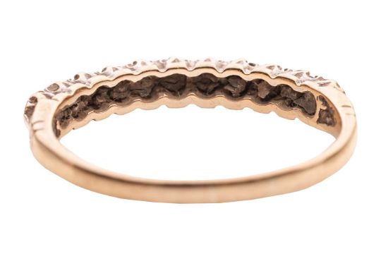 A sapphire and paste-set half-hoop ring, claw-set in an alternating pattern, to a 9ct gold mount, size Q; 1.8 grams