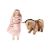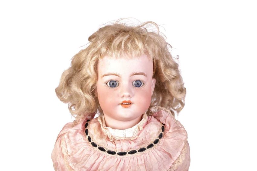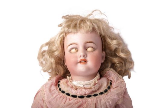 A large Simon & Halbig bisque head doll, numbered '2' to the rear of her head, with open mouth (upper teeth showing), jointed limbs and sleeping eyes, in a pink dress with lace undergarments, with lace and straw hat, c.55 cm, together with an early 20th century childs pull-along donkey, now lacking wheels, 48 cm long.