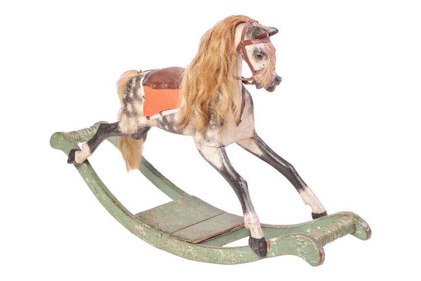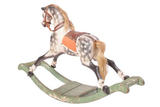 An early 20th-century small child's wooden rocking horse, of typical form, dapple grey, on a painted wood base, 62 cm high x 99 cm wide.