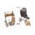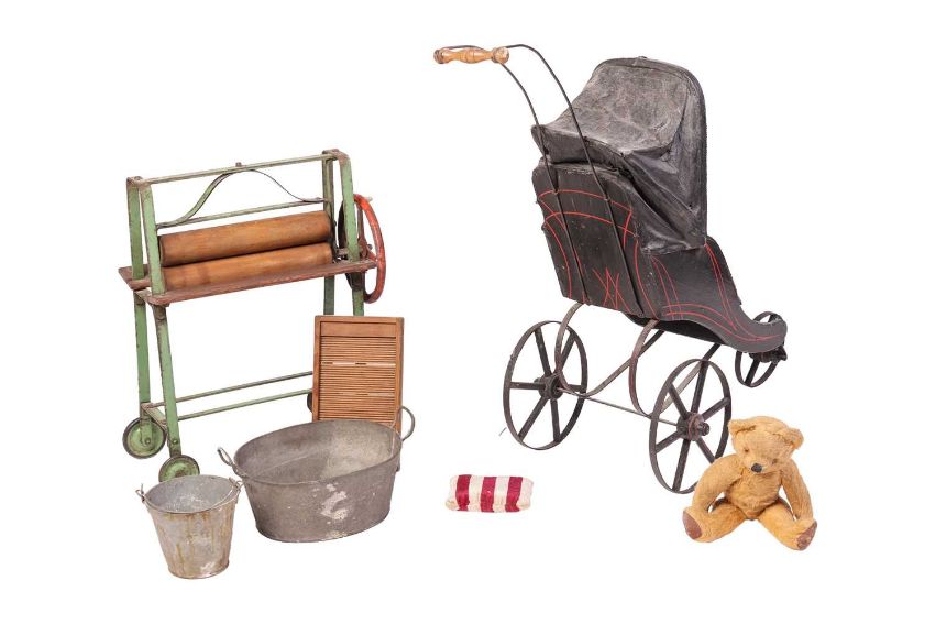 A child`s Triang washstand set, comprising a green and red-painted mangle, on four rubber mounted wheels, 49 cm high x 46 cm, two metal buckets and a wooden washboard, together with a Victorian sprung dolls pram, English, with three metal spoke wheels, lined carriage and foot-well, oil cloth hood and turned wood handle, 73 cm high, and a small mohair teddy bear.