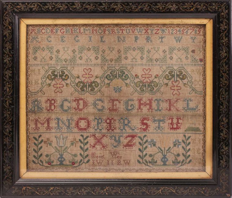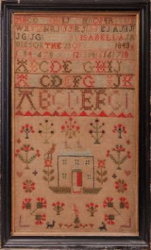A 19th century needlework sampler, completed by Isabella Jamieson, October 1843, depicting a house and garden with alphabet and numbers, glazed in an ebonized frame, 61 cm x 37 cm, together with another smaller, by Henet Weir, also framed and glazed, 36 cm x 41 cm.
