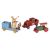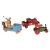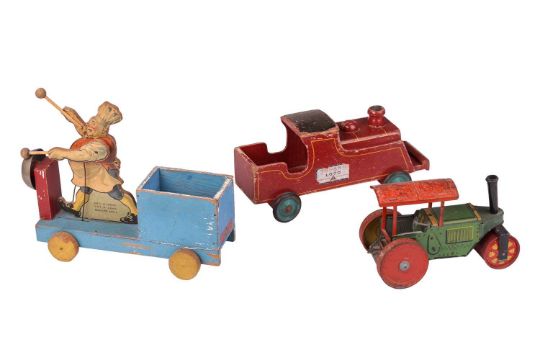 An early 20th century Chad Valley wooden 'Pat-a-Cake Bakers Man' pull-along musical toy, with the logo 'The Chad Valley Company Ltd, Harborne', brightly coloured in blue, red and yellow, the figure playing a bell when the vehicle is in motion, 30 cm high x 33 cm, together with a Trianf wooden 'Loco' pull-along steam engine, on iron and rubber wheels, 32 cm long, and a mid-century tinplate clockwork steamroller, 24 cm long.