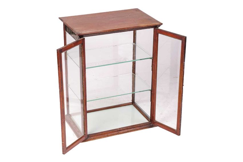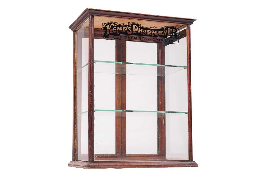 An early 20th century mahogany counter top shop glazed display cabinet, marked 'Kemp's Pharmacy Ltd, Chemists and Opticians', with glass-shelved interior and rear twin-doors, 72 cm high x 54 cm x 36 cm.