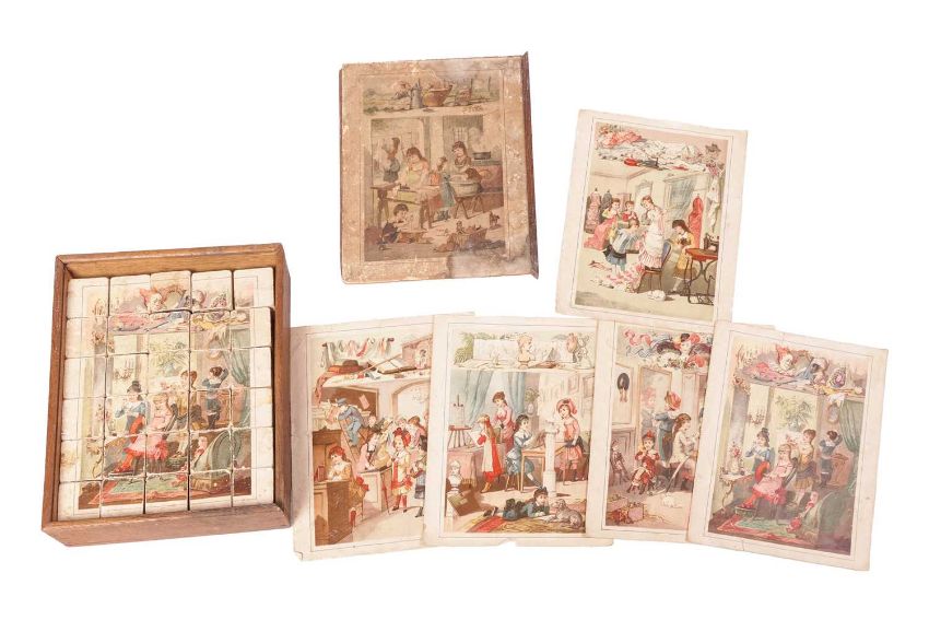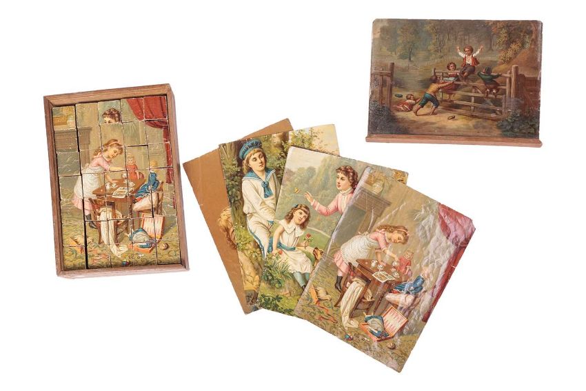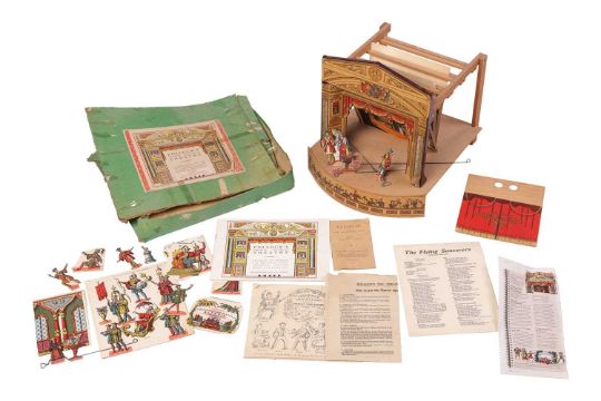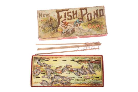A boxed late 19th Century/early 20th Century 'Fish Pond Game', by McLoughlin Bros. New York, patented 1890, together with a Pollock's 'Original Victorian Theatre', partially built with original box and contents, and three boxed late Victorian/Edwardian block puzzles.