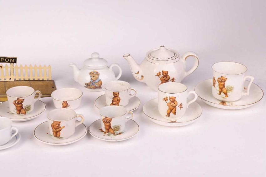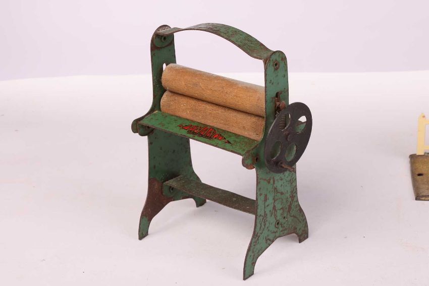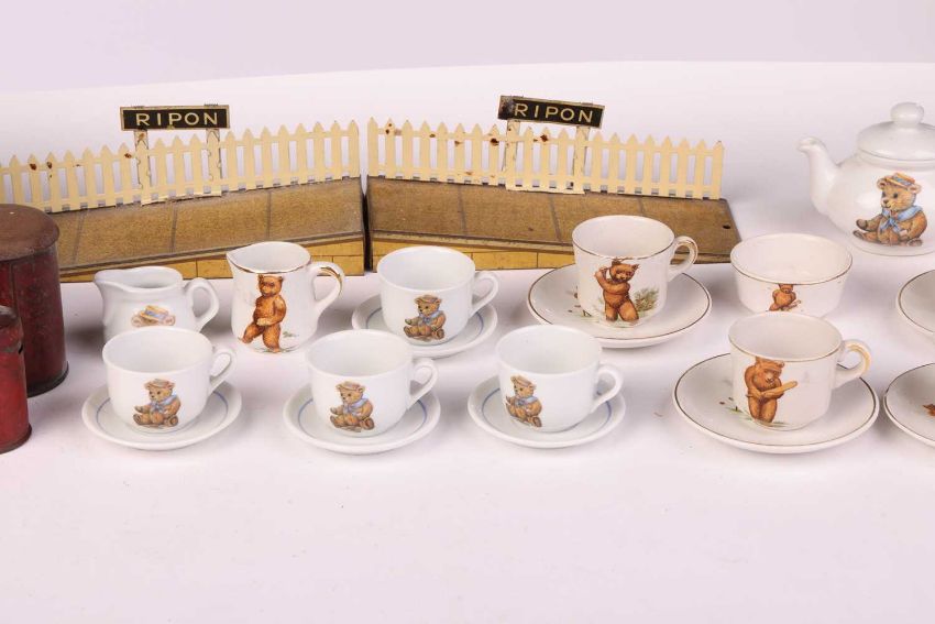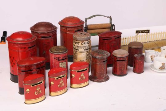A collection of Burnett Ltd (and others) tinplate money boxes, modelled as traditional red post office boxes, the tallest 16 cm, together with two Hornby Series tinplate station platform sections, each for 'Ripon', a children's china tea set, decorated with bears, and a Remanco miniature clothes mangle.