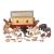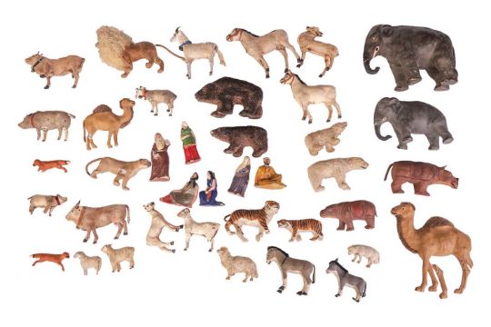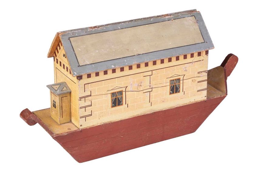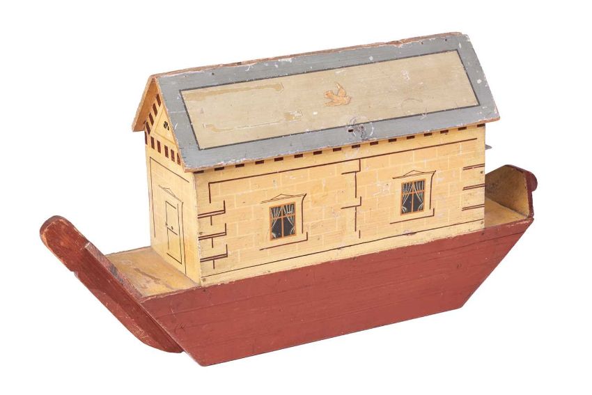 A late 19th century German wooden Noah's Ark, likely original paintwork, 31.5 cm high x 56 cm x 156 cm, together with six painted wood figures (Noah and others), and a collection of mis-matched animals, of varying size and material.