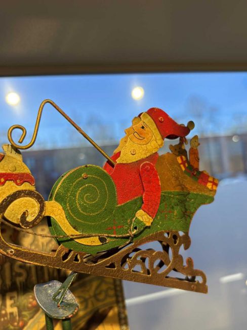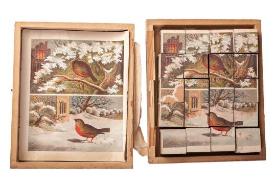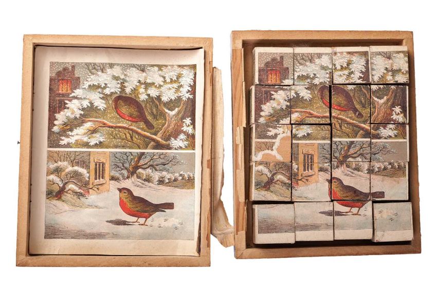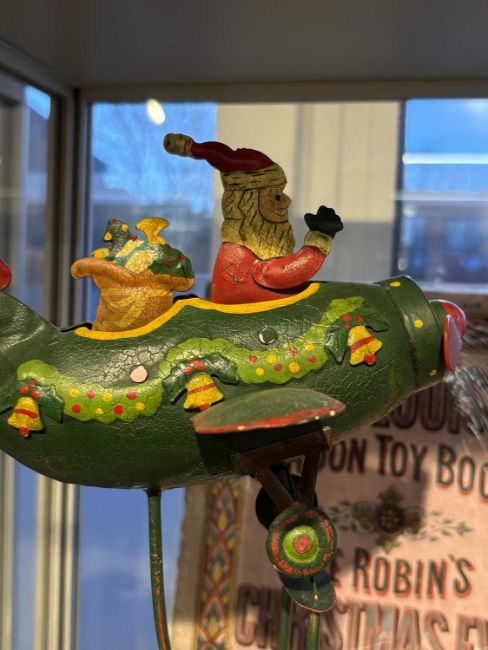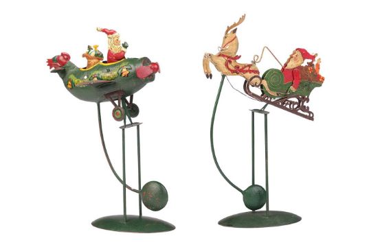 Two vintage Christmas folk art pendulum swinging models, early 20th century each, featuring Father Christmas and with moving parts, tallest 34 cm, together with a boxed puzzle by Frederick Warne & Co, New York, 'The Robin's Christmas Eve', with accompanying literature.