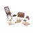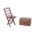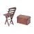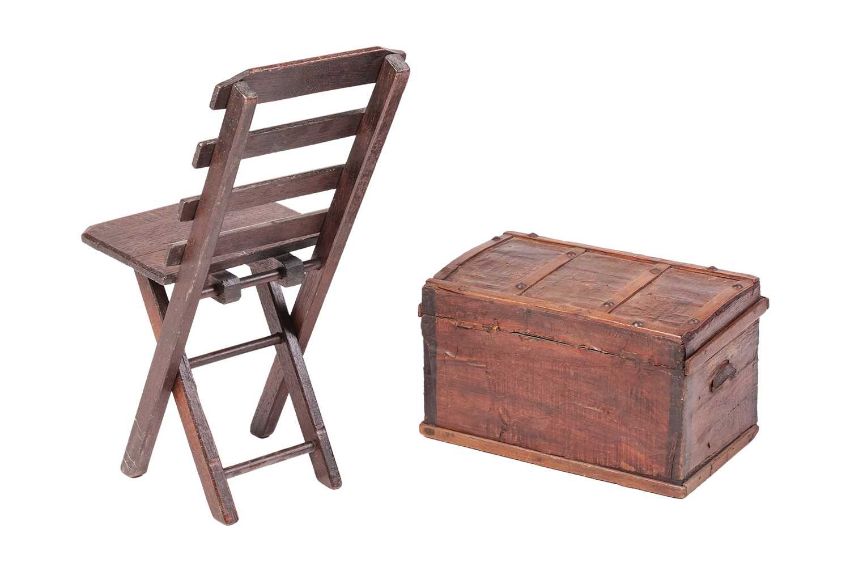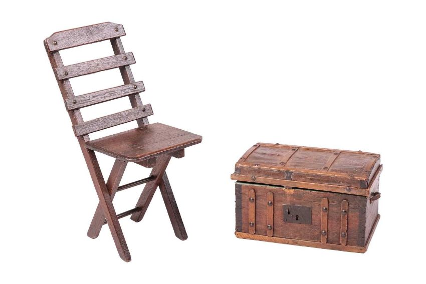 An early 20th century papier mache box, modelled as a wooden toy trunk, 19 cm x 34 cm x 19 cm, containing assorted vintage toys to inlcude a dominoes set, miniature playing cards, a musical box, fans, and other items, together with a wooden folding doll's chair, 52 cm high x 23 cm wide.