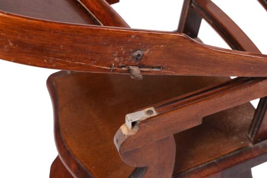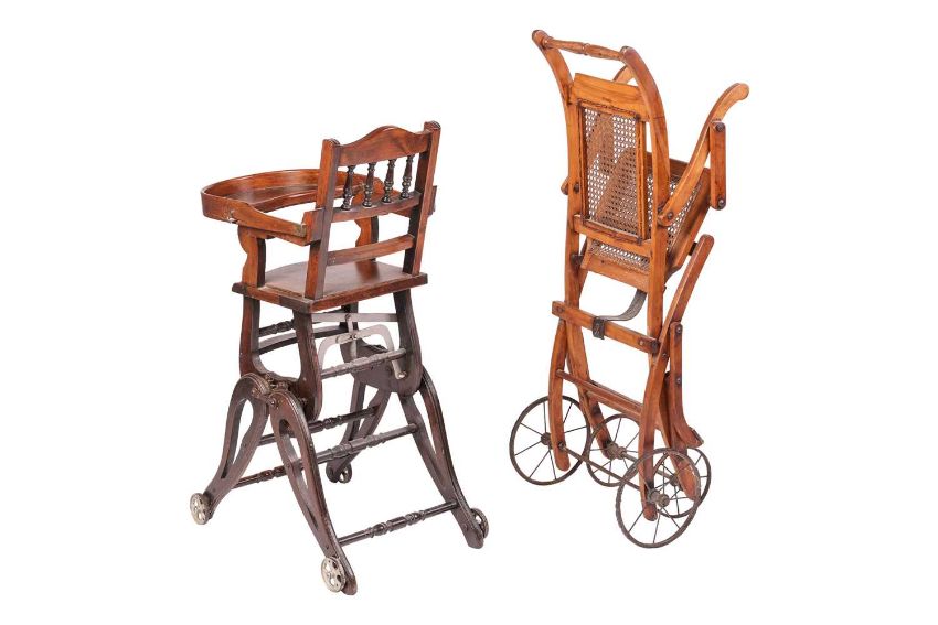 An Edwardian beech child's pushchair, folding with cane seat and back, on spoked wheels, 88 cm x 43 cm, together with a similar period mahogany child's highchair, also on wheels, 93 cm x 40 cm.