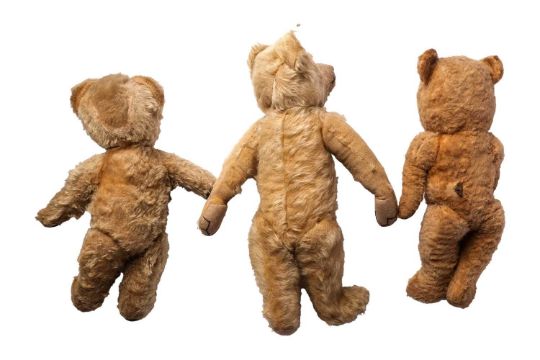 An early 20th century mohair teddy bear, with working musical box (playing a lullaby), 41 cm, together with two further teaddy bears, the largest c. 45 cm.