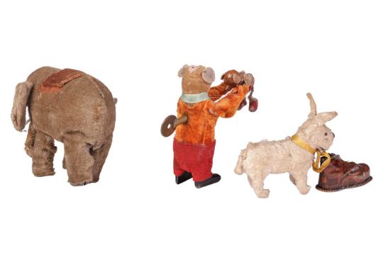 An early 20th century clockwork elephant, fabric covered with tinplate tusks, 9 cm high x 11.5 cm long, together with a Schuco tinplate clockwork toy, modelled as a bear holding aloft a mouse, 13 cm, and a further similar toy, a dog with a boot in its mouth.