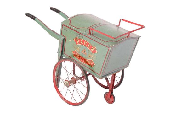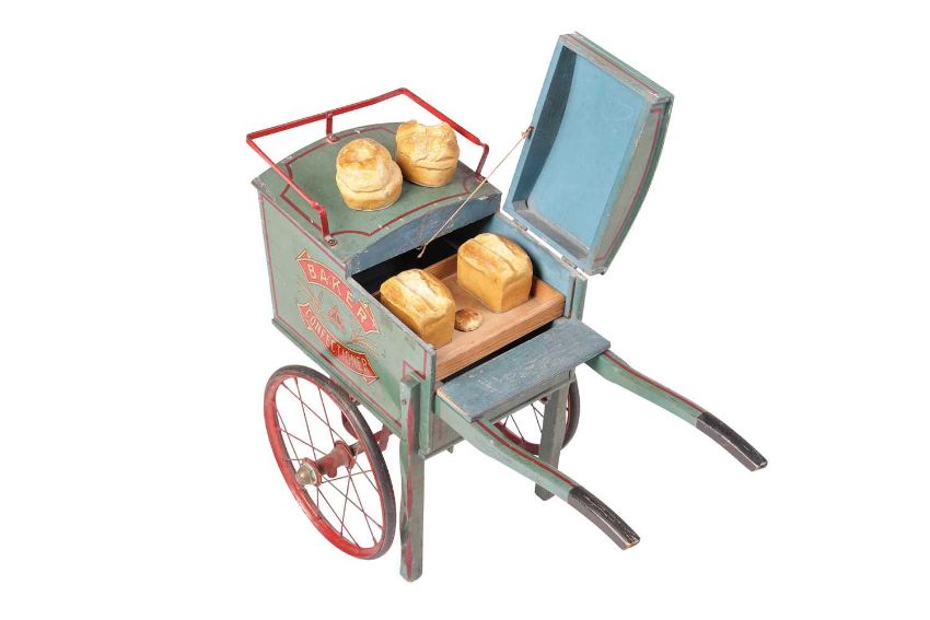 A Lines Bros.'Baker and Confectioner' toy wooden hand cart, early to mid 20th century, large transfer to sides with L. Bros Ltd London triangular logo, spoked metal wheels with black rubber tyres, the top opening to reveal a tray of baked model bread, 52 cm high x 73 cm wide.