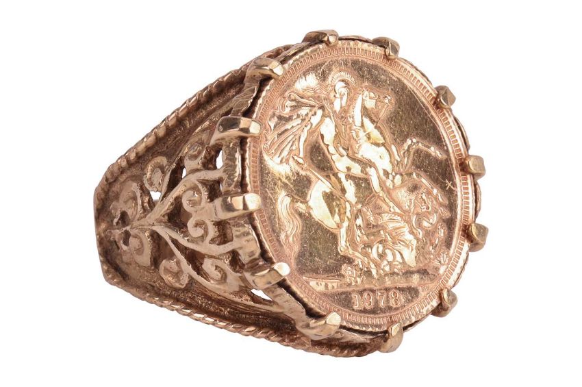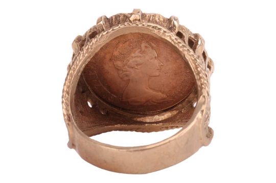 An Elizabeth II 1978 sovereign in a 9ct gold ring mount, of scrolled foliate design with twisted cable details, ring size V, 16.7 grams.