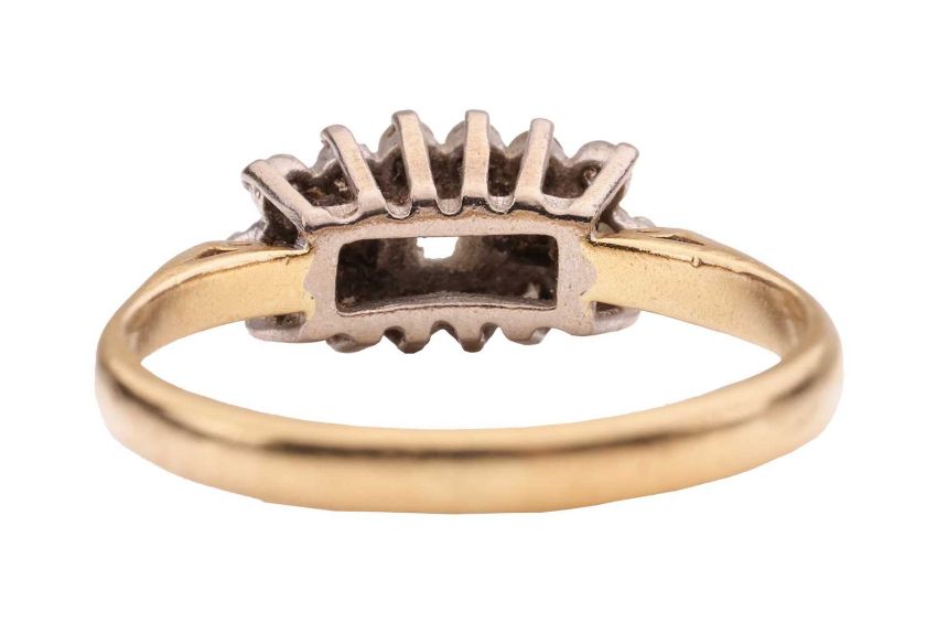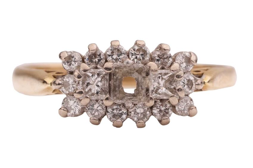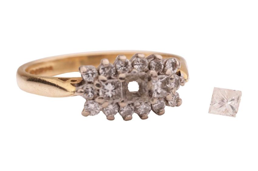 A diamond-set cluster ring, featuring three graduating princess-cut diamonds, central stone loose, claw-set in yellow metal and encircled by a border of fourteen round brilliant-cut diamonds, to an 18ct yellow gold ring shank, ring size L ½, 3.2 grams.