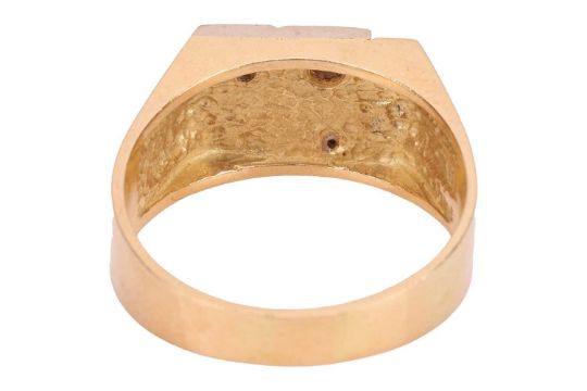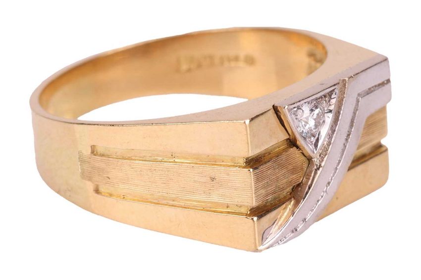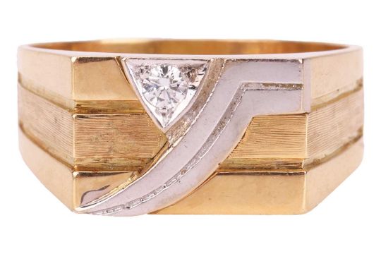 A diamond-set two-toned dress ring, the rectangular ring head centred with a recessed band, with a round brilliant-cut diamond of 0.10ct highlighting the geometric motif, to a tapering flat shank, stamped '18ct', ring head 1.6 x 1.0 cm, size Y, 10.7 grams.