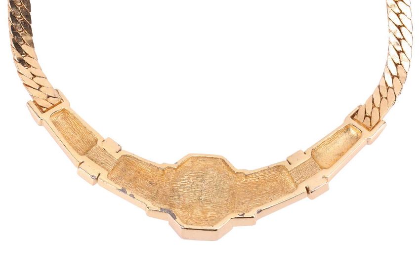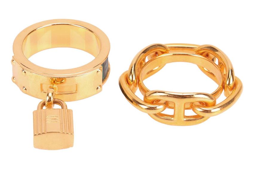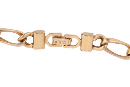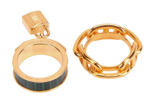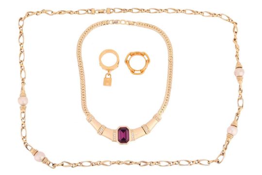 Two Christian Dior costume jewellery necklaces, one set with a large purple paste in gold-tone gilt metal, the other chain necklace interspersed with faux pearls, both signed; together with two Hermes scarf rings, one of 'Regate' design, the other a "Kelly Cadena" design, with inset faux lizard skin and padlock charm, both signed and boxed.