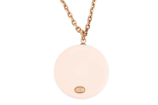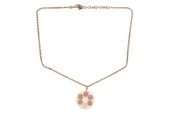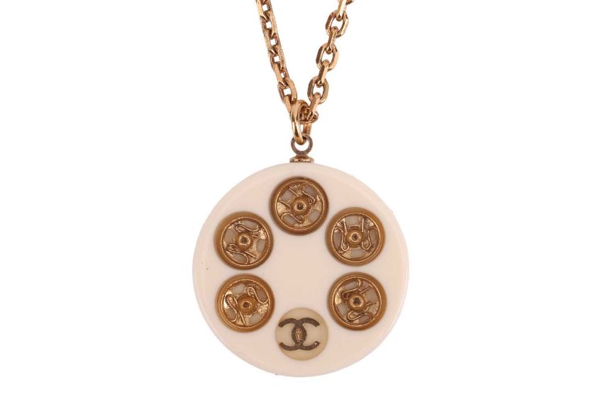 Chanel - Autumn 2003, a circular pendant in cream and clear acrylic, inset with gilt metal poppers and interlocking CC motif, suspended from a gilt metal chain, with hook clasp and logo charm, signed Chanel, 11.0 grams.