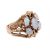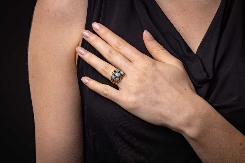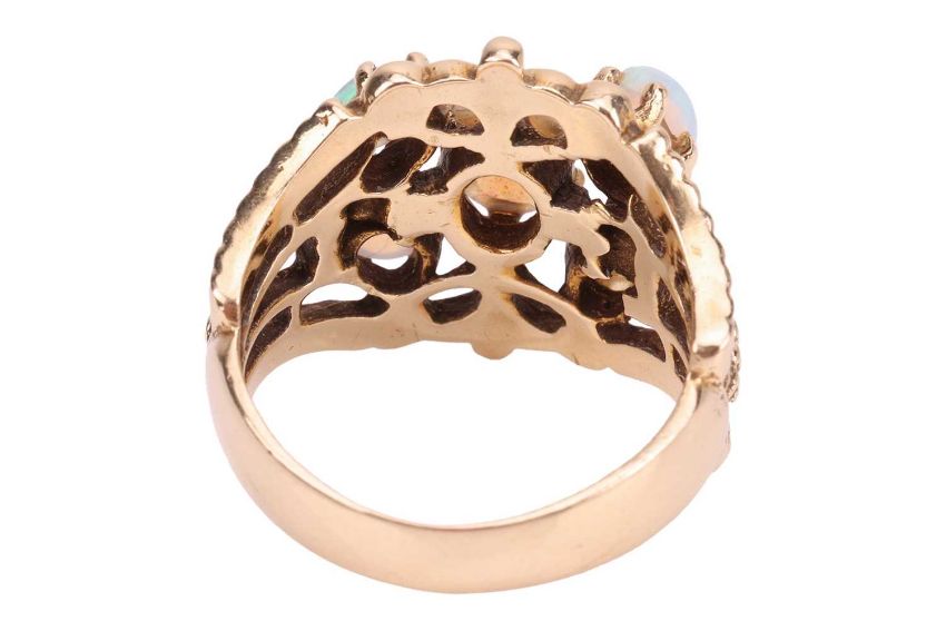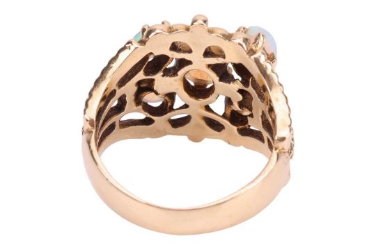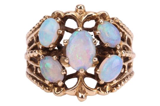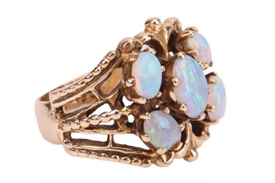 An opal cluster ring, the openwork mount with beaded details, claw-set with five precious opal cabochons, leading to a tapering band, yellow metal stamped '14K', size K, 5.5 grams.