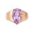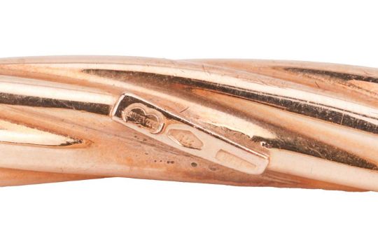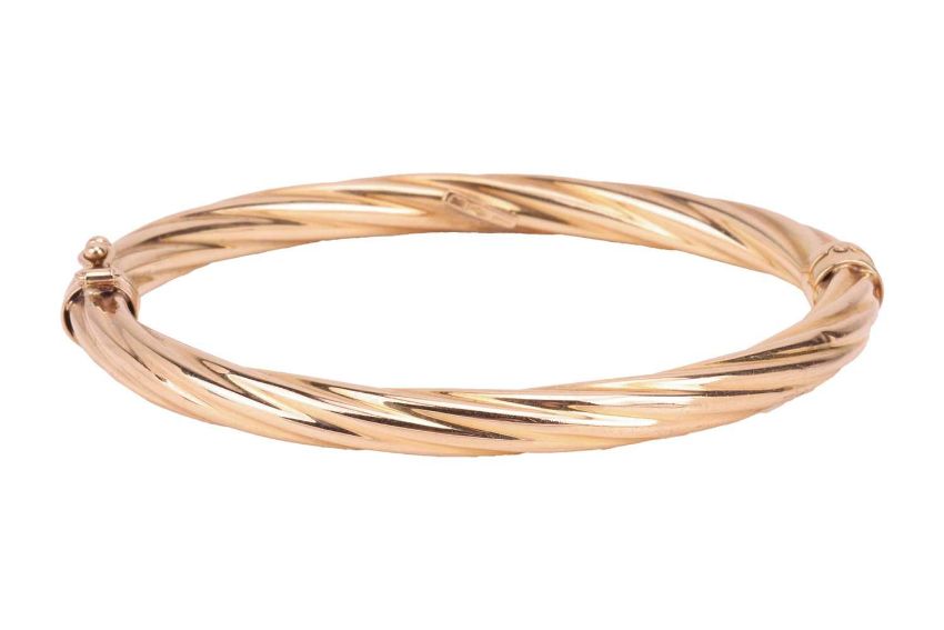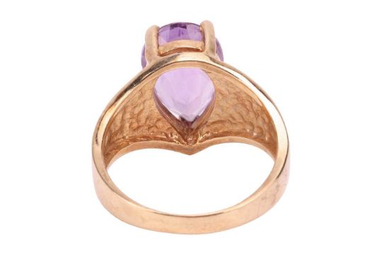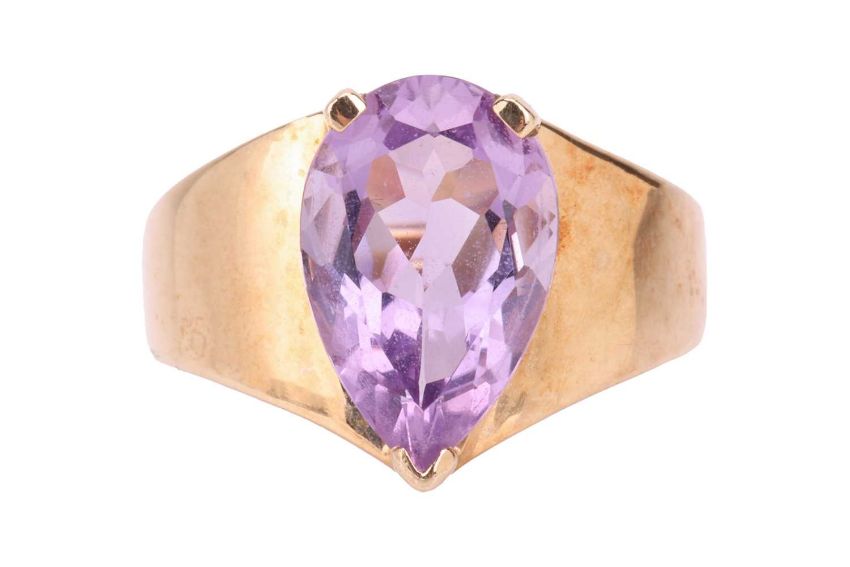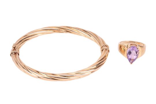 A 9ct gold amethyst ring and a 9ct gold bangle; the ring comprising a pear-shaped amethyst of light purple colour, claw-set in 9ct yellow gold and to a graduating yellow metal ring shank marked ‘375’, ring size P ½, 4.5 grams; The bangle of twisted form, in 9ct yellow gold, hinged and completed with a box clasp and additional safety catch, measuring 5.9mm wide, stamped with convention marks for 9ct gold, 17.0cm approximate inner circumference, 9.8 grams. (2).