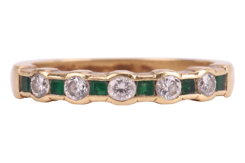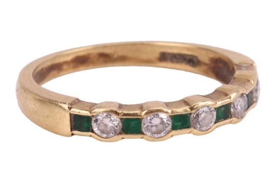 An emerald and diamond half eternity ring, featuring five round brilliant-cut diamonds, each interspersed with a square-cut emerald, all in a channel setting in yellow metal surface testing as 18ct, ring size M ½, 3.1 grams.