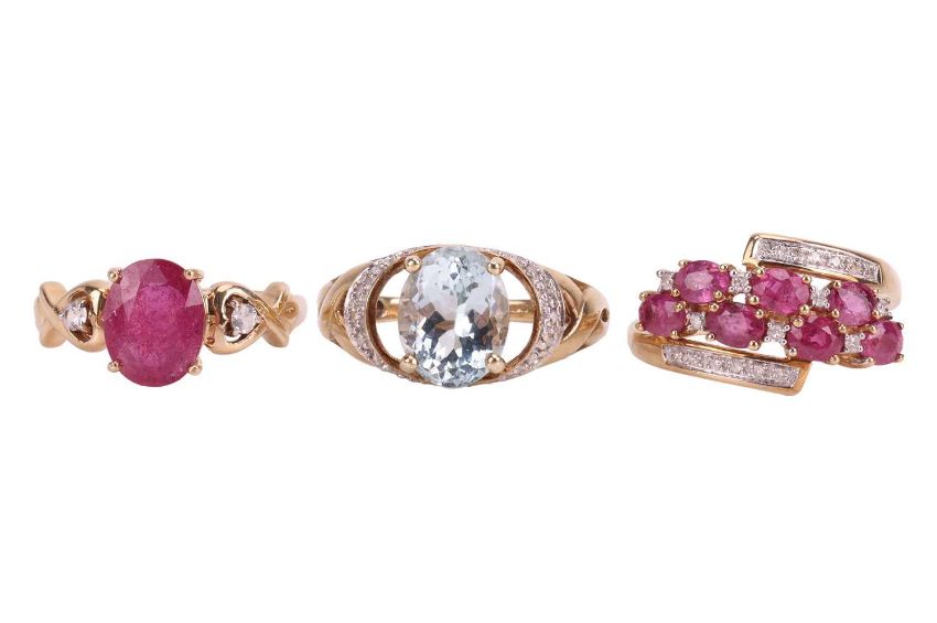 Three gem-set rings in 9ct gold; to include an aquamarine and diamond dress ring, centred with an oval-cut aquamarine of 10.0 x 7.8 mm, between pierced shoulders with diamond accents, size P; a ruby and diamond crossover ring, comprising two rows of oval-cut rubies interspersed with diamond accents, between bypass shoulders, size N; and a ruby solitaire ring, claw-set between heart shoulders adorned with circular-cut white sapphires, size N½; all struck with British convention marks, total weight of items 8.8 grams. (3)