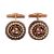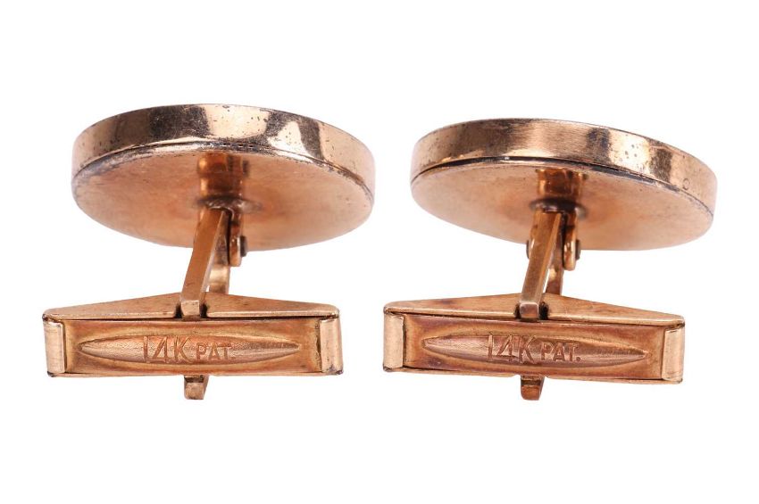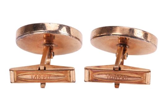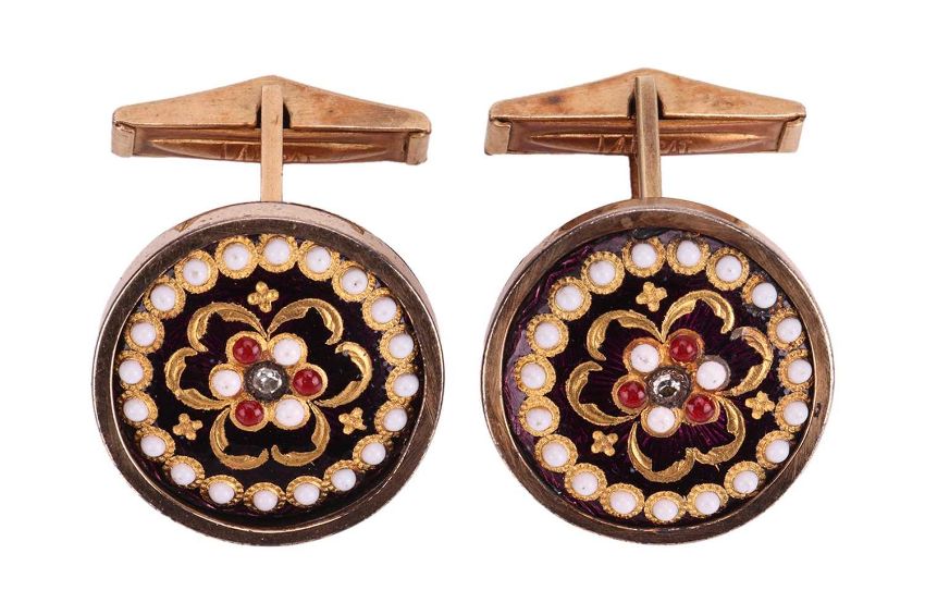A pair of diamond and enamel cufflinks in gilt metal, the circular panels centred with a trefoil motif embellished with a single-cut diamond, encompassed by a dotted white enamel border, hinged toggle fittings to the back, set in gilt metal, 2.2 cm wide.