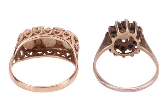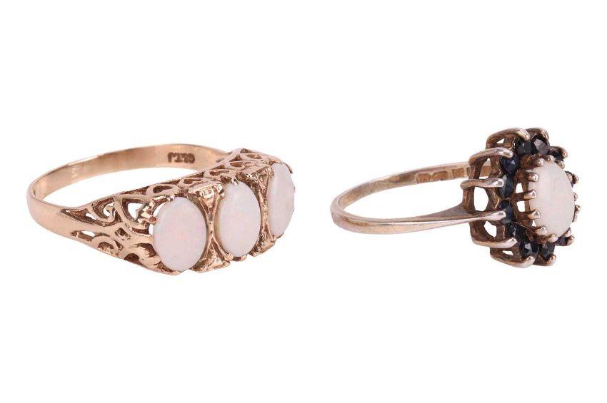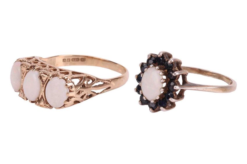 Two opal-set rings; The first an opal trilogy ring, comprising three oval opal cabochons, claw-set in yellow metal with heart motif gallery detail, in 9ct yellow gold, ring size S, 3.2 grams; The second an opal and blue sapphire cluster ring, featuring a central oval opal cabochon, encircled by twelve round-cut sapphires of dark blue colour, in gold-plated silver, ring size O ½, 2.3 grams.