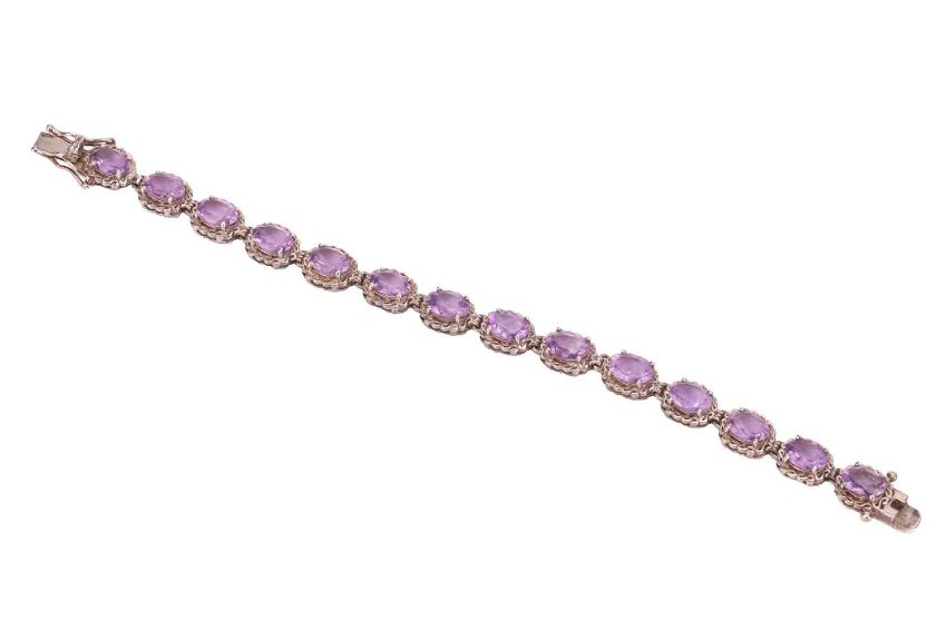 A group of jewellery items, to include; A single strand cultured pearl necklace, 72.0cm in length; A cultured pearl necklace, featuring oval cultured pearls and completed with a yellow metal spring ring clasp stamped ‘375’, 41.0cm in length; A keshi pearl and citrine necklace, featuring rows of five keshi pearls interspersed by collet-set oval-shaped citrines, with a 9ct lobster clasp (strand broken); A cultured pearl necklace, featuring a single row of oval cultured pearls, completed with a silver toggle grain-set with round-cut amethysts of varying hues of purple, 42.0cm in length; An amethyst line bracelet, comprising fourteen oval-cut amethysts in claw settings with twisted wire border, the articulated links in white metal and completed with an integral box clasp and two additional safety catches, 16.5cm in length.