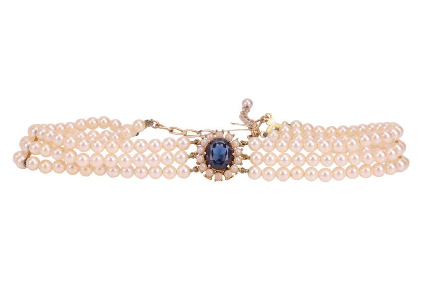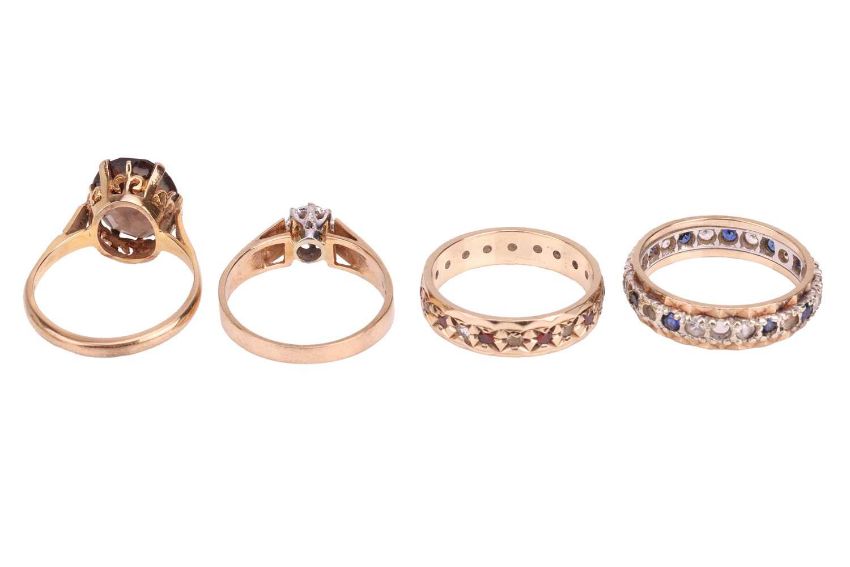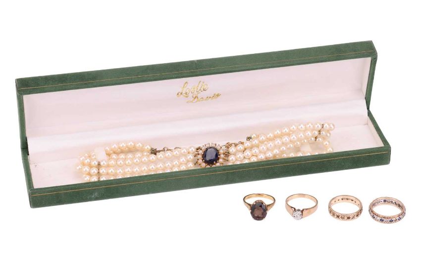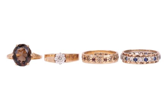 A small group of jewellery items comprising an illusion-set diamond solitaire ring, in a 9ct gold mount, size Q, a 9ct gold smoky quartz ring, size O1/2, a paste and synthetic sapphire-set ring in 9ct gold, size Q, a paste-set ring with bright-cut detailing in 9ct gold, size P and a pearl simulant bracelet, the clasp set with a synthetic sapphire; 49.9 grams (5)