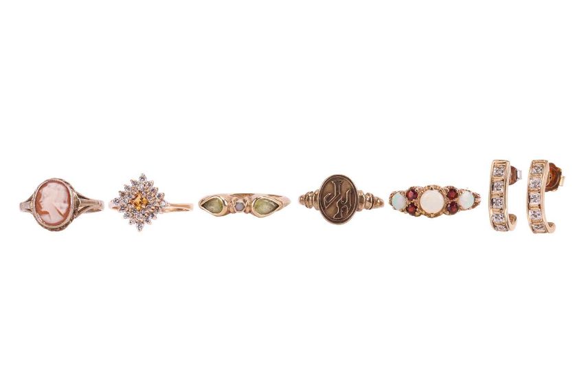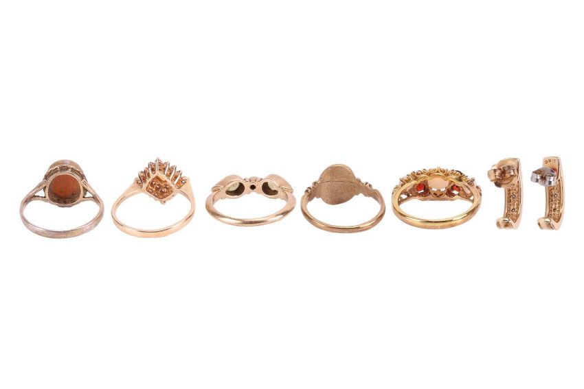 A group of five rings and a pair of earrings; The first a 9ct yellow gold citrine and cubic zirconia cluster ring, comprising a square-cut citrine encircled by two rows of round-cut cubic zirconia, the ring head measuring 13.4mm x 13.4mm, ring size O, 2.5 grams; The second an opal and garnet cluster ring, featuring three graduated round opal cabochons, each interspersed with two round-cut garnets of brownish-red colour, in a 9ct yellow gold ring shank with convention marks, ring size N, 2.9 grams; The third a peridot and seed pearl ring, featuring two pear-shaped peridot interspersed with a seed pearl, to a 9ct yellow gold ring shank, ring size O, 31. Grams; The fourth a gilt metal signet ring, size N; The fifth a gilt metal cameo ring, size N ½; The earrings each featuring five single-cut grain-set diamonds, in yellow metal marked ‘9K’, to post fittings with butterfly backs (one a later replacement), 3.0 grams. (6).