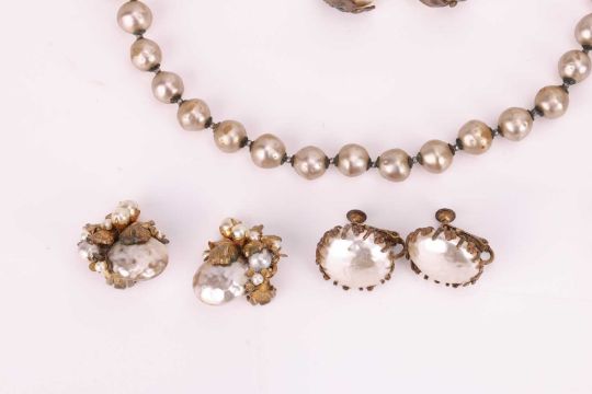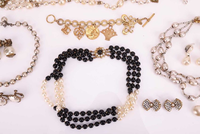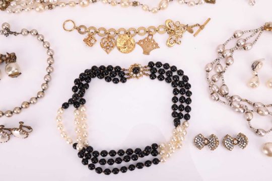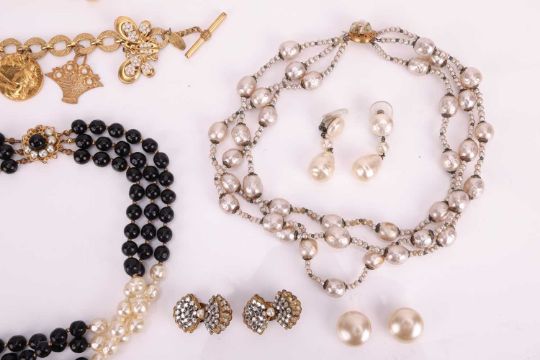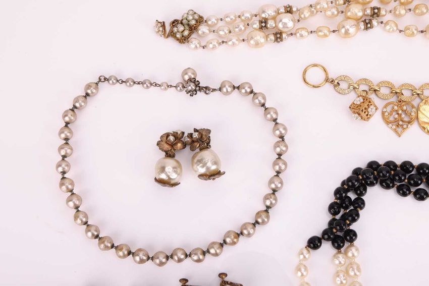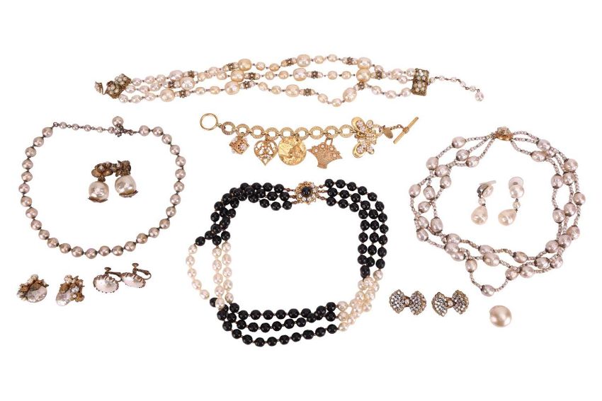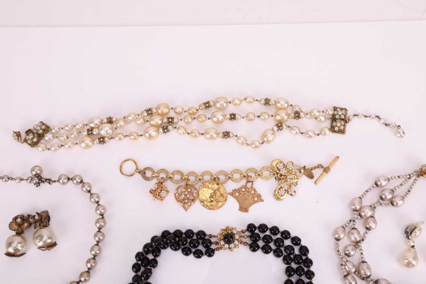 A large group of costume jewellery by Miriam Haskell, comprising a charm bracelet, a triple-row necklace of faux pearls and black glass beads, and three additional faux pearl necklaces together with six pairs of faux pearl clip earrings, all signed 'Miriam Haskell'.