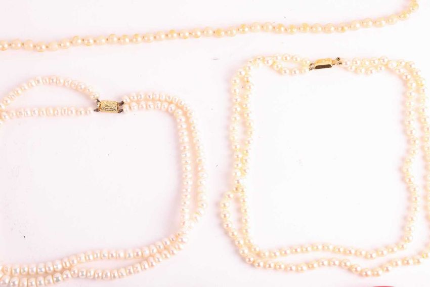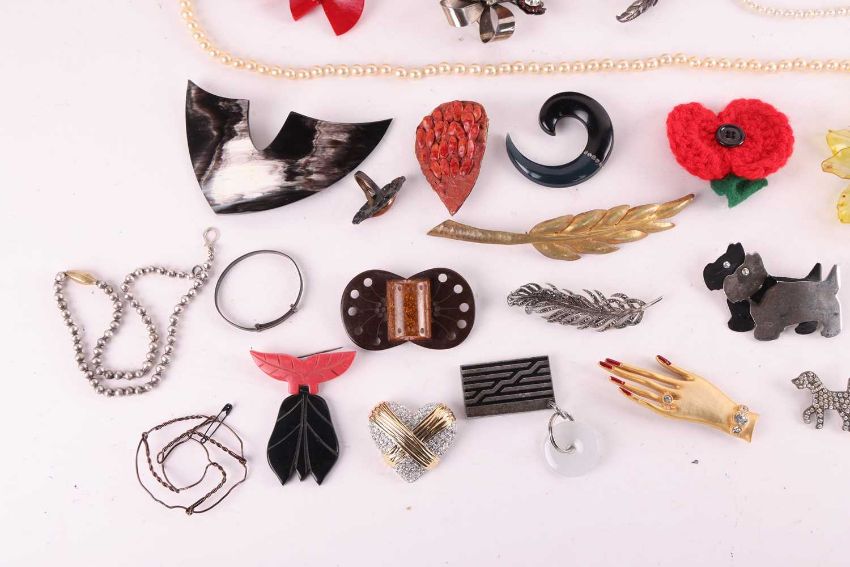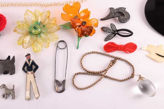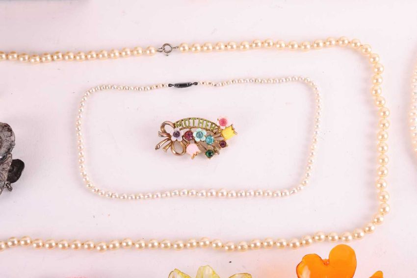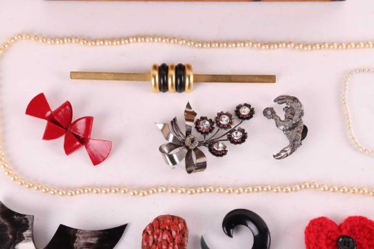 A box of costume jewellery, including a quantity of vintage acrylic and paste-set brooches, with examples by Jean Muir, Van Der Strasten and others, as well three cultured pearl necklaces, two with yellow metal clasps stamped "375", and another with a white metal and marcasite-set clasp stamped "925", together with further faux pearl examples, and other items of jewellery.